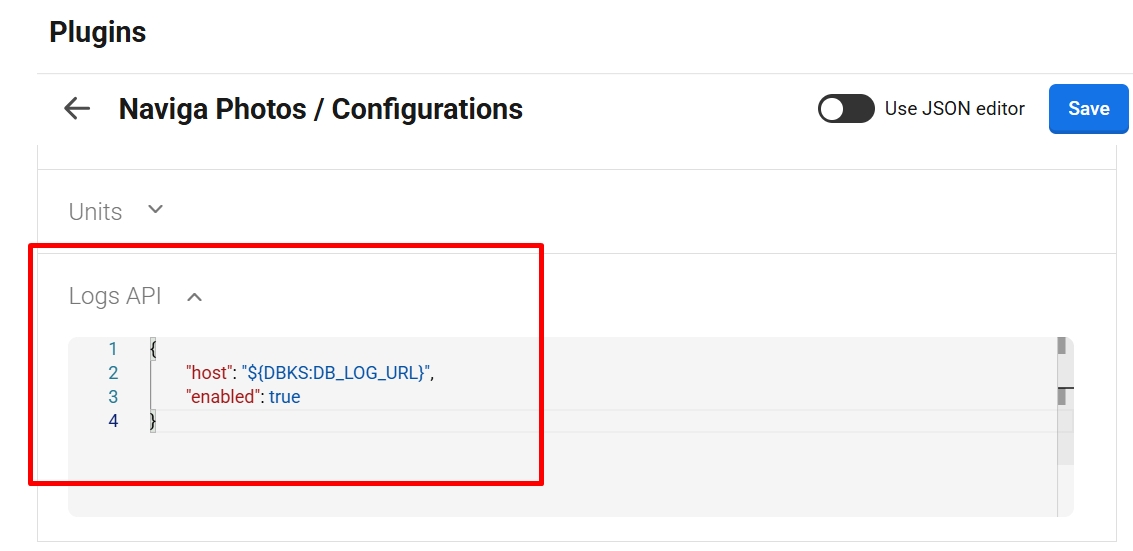 This logging mechanism is configurable via the enabled flag (true or false) under the logsApi configuration.