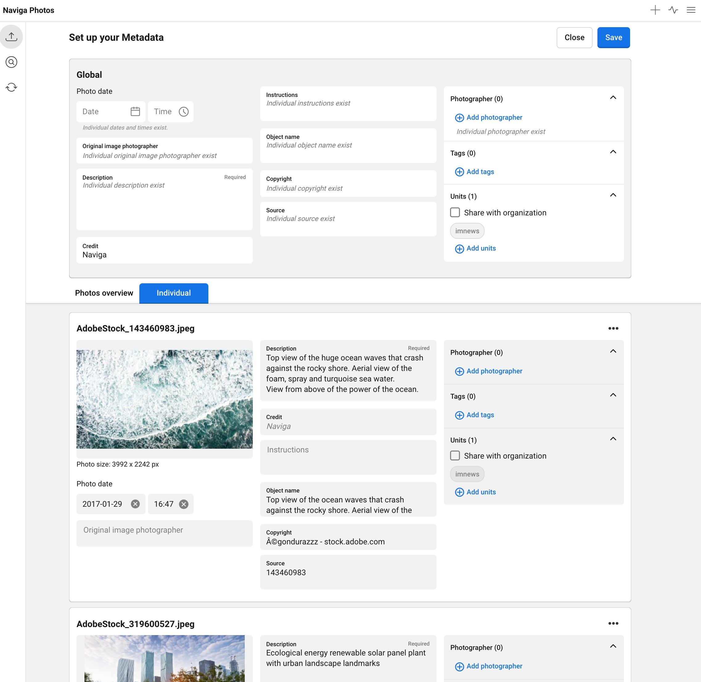 As we described earlier, you have two different view of presenting the photos: 1. As an overview, the photos presents as thumbnails and you choose which photo you want to edit by clicking on it. 2. Individual, every photo is already expanded so the input field for the metadata is visible directly
