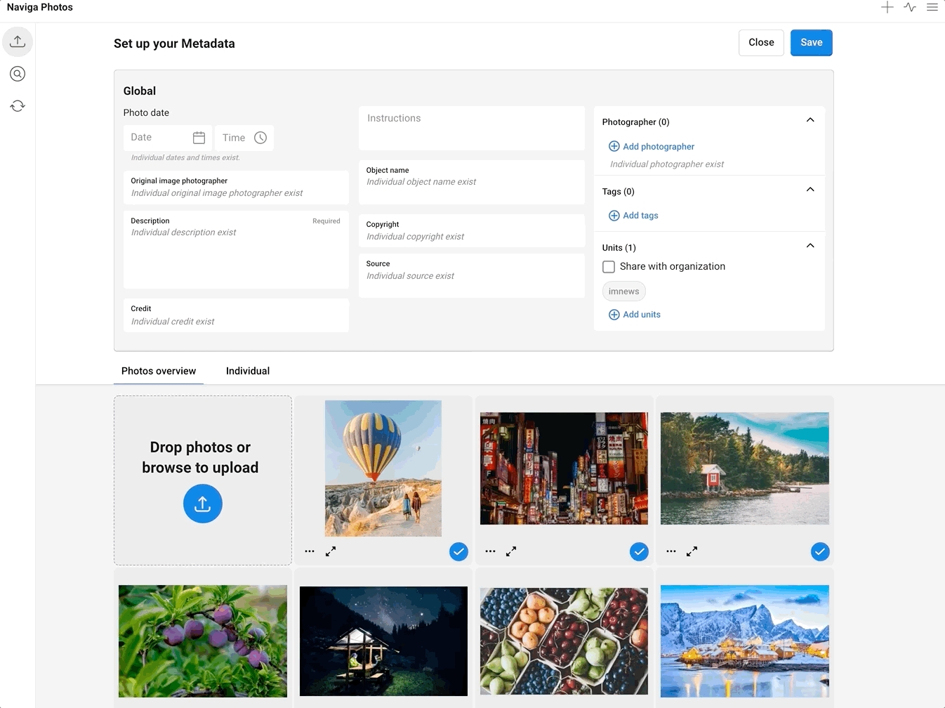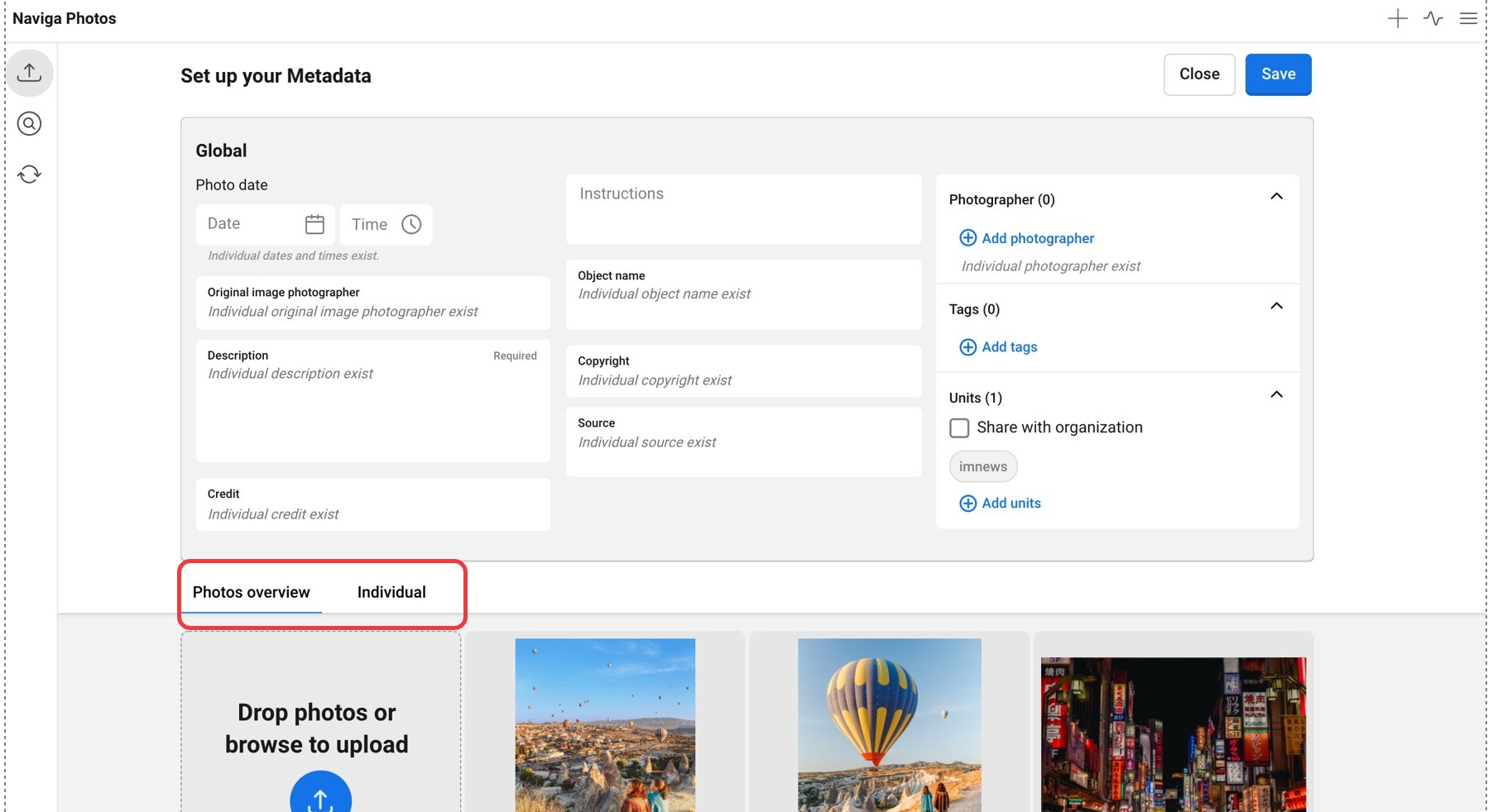If you want all the photos to show expanded metadata, you choose the individual tab. Here is every photo already expanded. If you want to remove a photo from being uploaded, you open the tree dot menu and chooses Remove from selection.