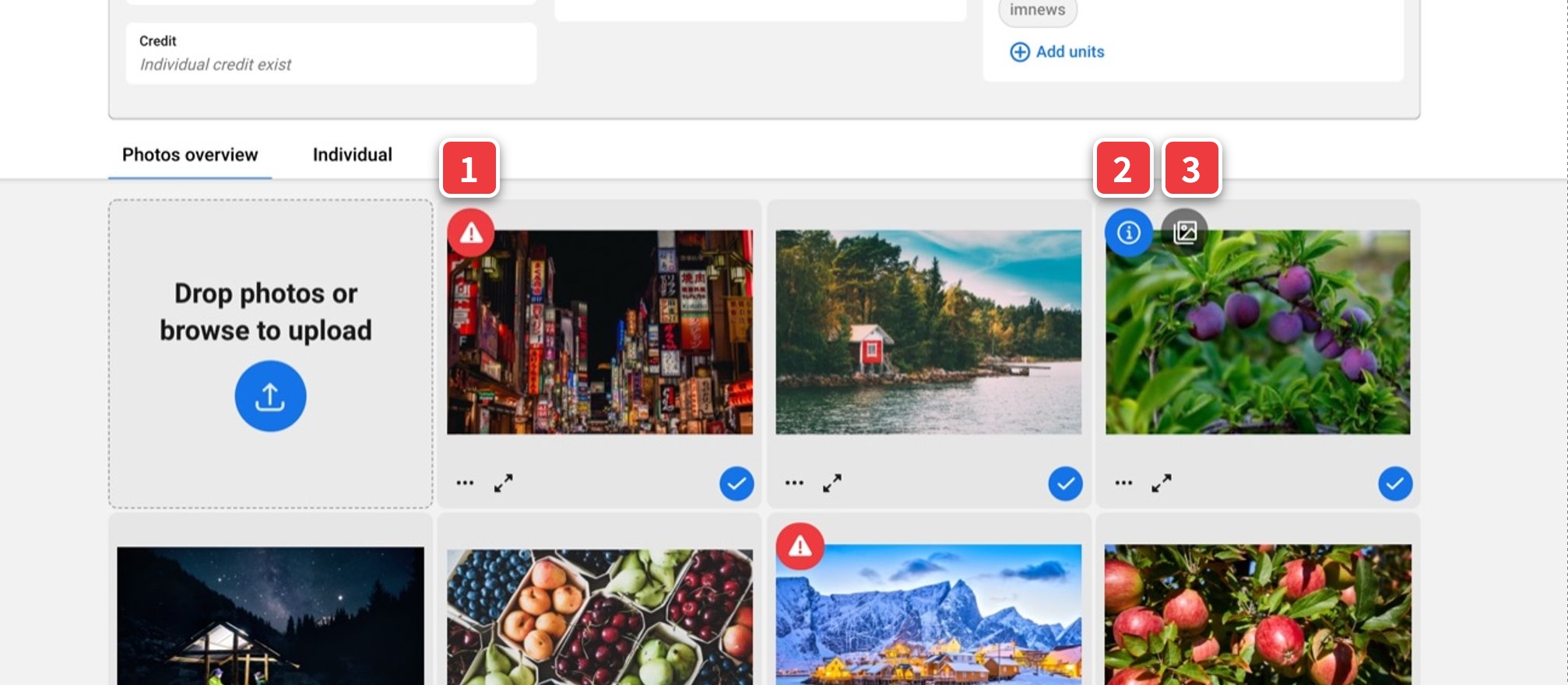 You can also remove the photo from the uploading by opening the tree dot-menu. When you choose Remove from selection, the photo will be removed from the list. If you want it back you have to add it to the list again by using the function for this to the left of the first thumbnail.