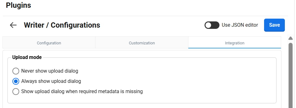 Make sure the "**Always show upload dialog"** setting in the writer plugin is enabled to use this feature.