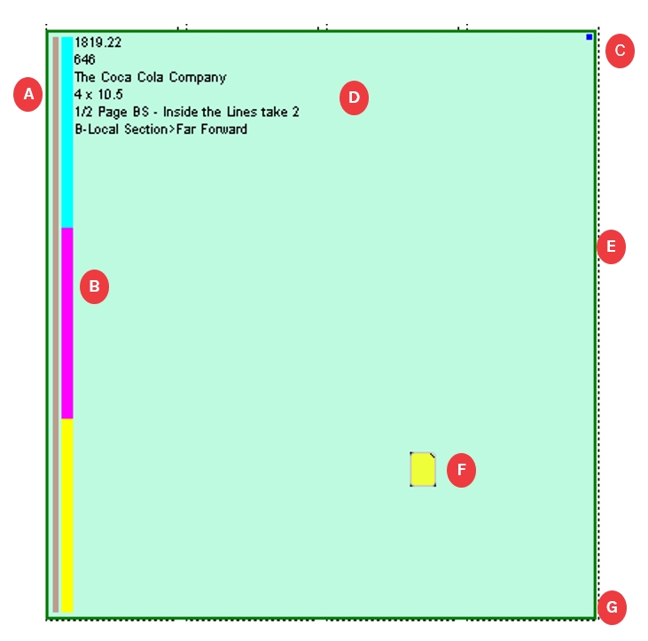 Solid thin Color bar representing the Section of the display ad (the gray bar along the left edge in picture above). Optionally, the ad layout may be filled with the classification color, in which case the classification bar will not be displayed since the entire ad will be colored by class/section. The colors are assigned by Plan (not user configurable) to enable quick distinction of classification groups.