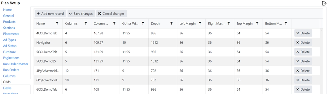 Grids are where you define the number of columns on the page, their width and depth, the margins and the gutter width. These are in points. The user in the Naviga Plan system can define in his/her preferences the unit of measure to use for display, but in setup, everything must be done in points.