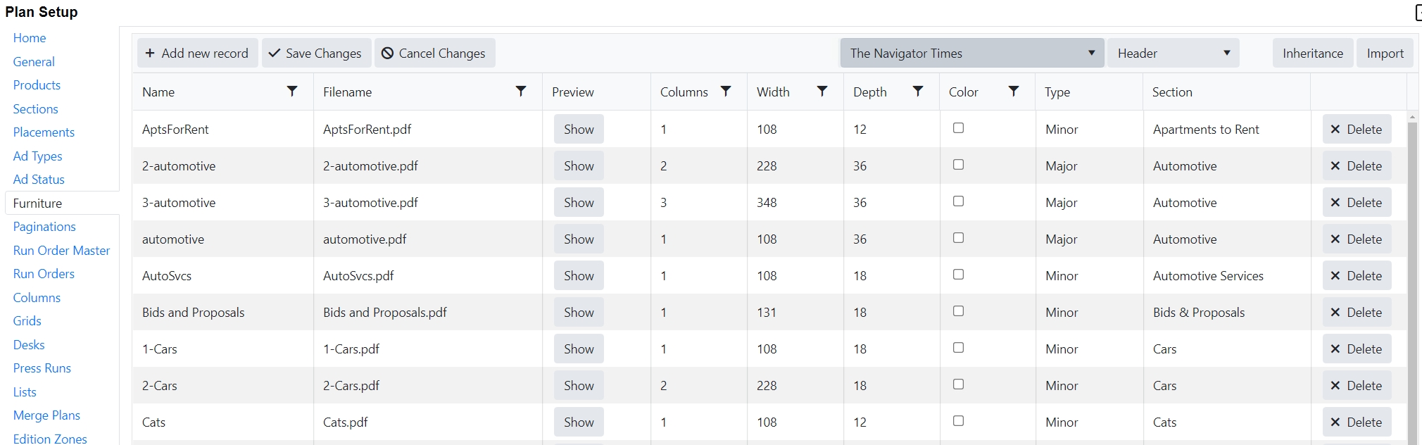 Furniture includes all your headers, banners, and filler ads. This will primarily be used for our Newspaper customers in their classified section. If you do not have classifieds, or do not have a need for headers, fillers, and banners, you may skip this part of the setup.