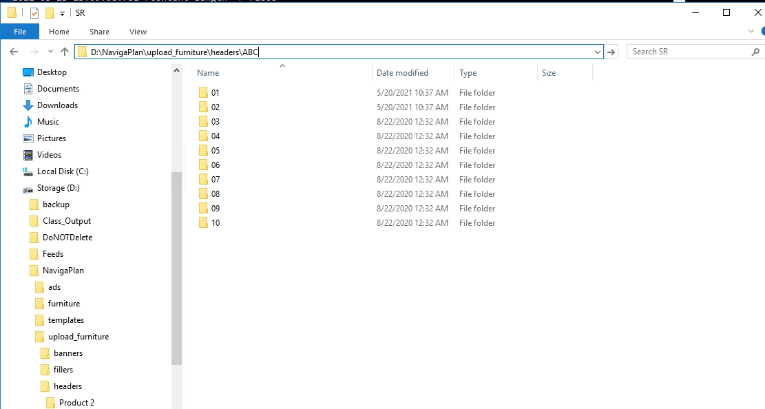 In the “upload_furniture” folder you will find a subfolder for banners, fillers, and headers. In each of these subfolders, we have Product 1 and Product 2 subfolders, each with numbered folders underneath. The numbered folders at the lowest level represent the number of columns in the material. You may delete folders if you have fewer than 10 columns to a page, or you can add more if more are needed. Copy the folders as needed so that you end up with a folder for each of your plan products. Rename Product 1, Product 2, etc to be the Product Code that you have set up on the Product setup in Naviga Plan. One folder for each product. Each Product folder should have column folders under it corresponding to the number of columns on that product’s page.
