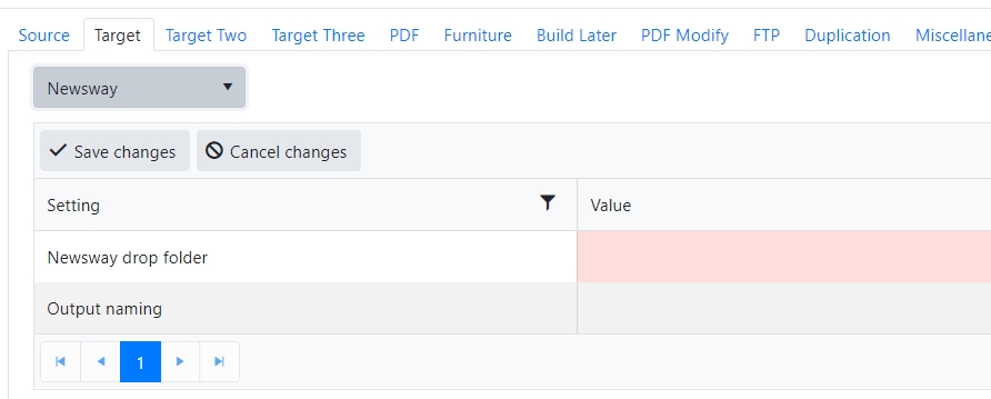 Target/Target Two/Target Three/Target Four all have similar options. What is configured in here will be the Editorial system output choices inside Naviga Plan (Found in Naviga Plan under File > Output). Most sites will not need to utilize all four targets, but this allows you to have up to four different output channels/target systems.