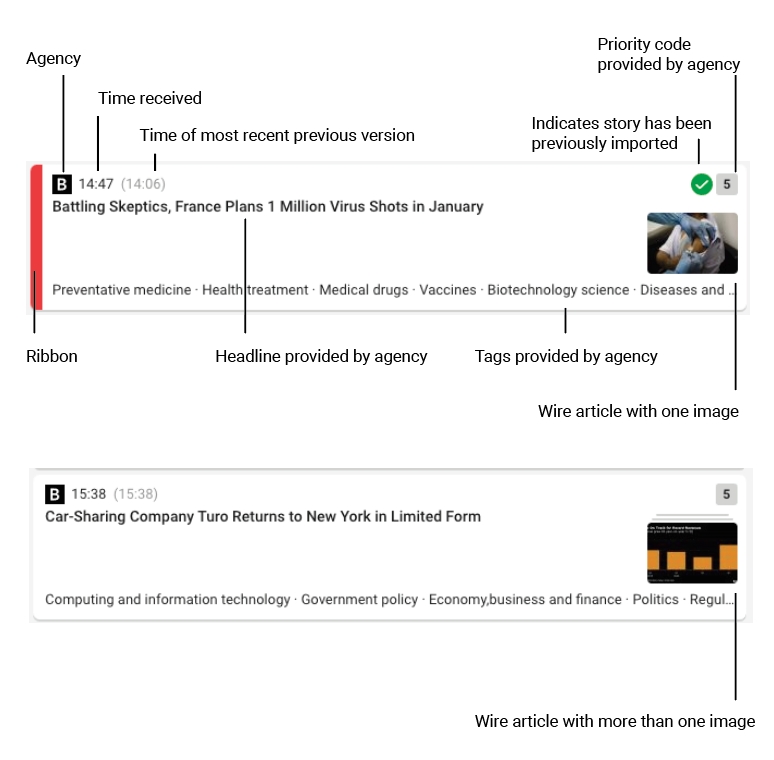 The ribbon is configurable by agency to match a particular piece of metadata provided by the agency. For example, stories tagged "breaking" by an agency might have a red ribbon. Check with your administrator for your specific implementation of the ribbon.