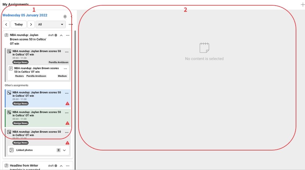 In this view you will see a list of your assignments for a specific day (1). To the right you have a working space where you can work with your article or your photos. (2)