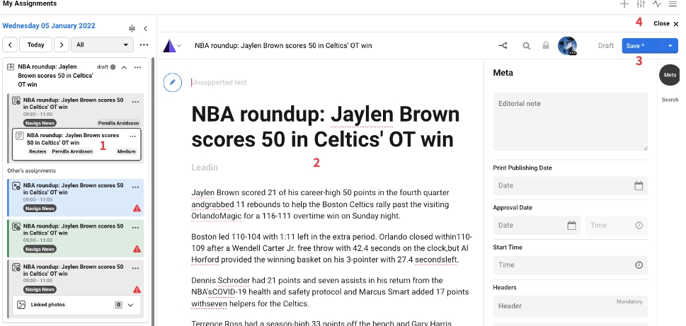 When there is an article created on the assignment you click on the article. You see that your article will get a black border so you easily see which assignment you are working on (1). The article will be opened to the right of the screen (2). You work on your article and click on Save when you are done with your editing (3). You can also click on Close if you have nothing to save (4).
