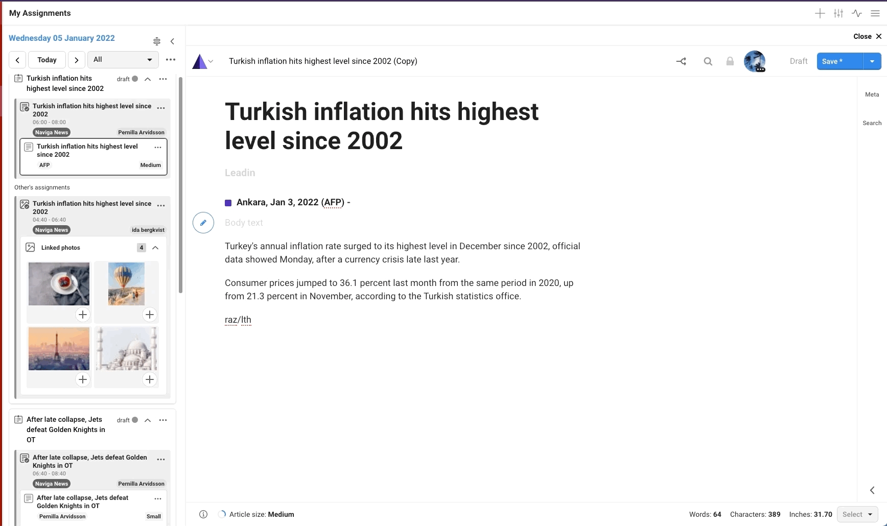 As we described earlier in this guide you will clearly see if there are linked photos from a photo assignment on the same plan as your text assignment belong to. In the example below you have an article assignment. Ida Bergkvist is an assignee on a photo assignment on the same plan and she has linked 4 photos in her assignment. Since both assignments belongs to the same plan you see her linked photos.