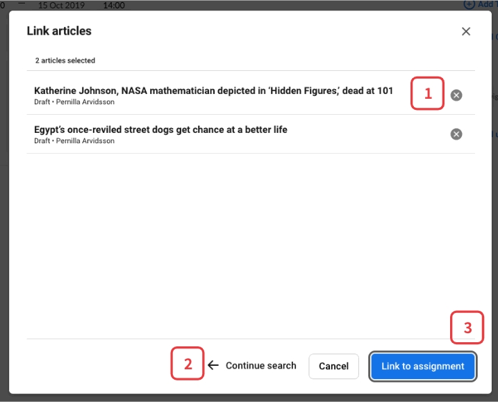 If you choose to View selection before you link the articles, you see a list of the chosen articles. If you want to remove an article from the list you can do this by clicking on the delete icon (1). If you want to go back and choose more articles you dot this by clicking on Continue search (2). If you are satisfied you click on the button Link to assignment (3).