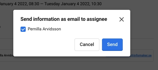 When you have clicked on the sharing icon a dialog will opened up. The assignees in the assignment will be suggested. So of you have several assignees but only want to send the email to one, you deselect the ones that should not get the email. When you click on Send, the assignees will get an email with the information that contains the information in the assignment.