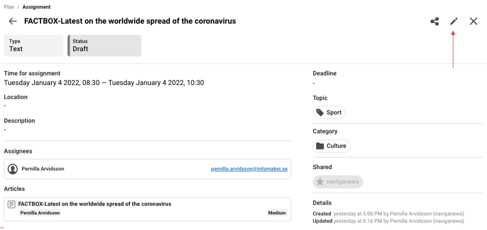 If you want to edit an assignment you open the card either from the assignment list or from the plan. Open it for editing by clicking on the icon for editing.