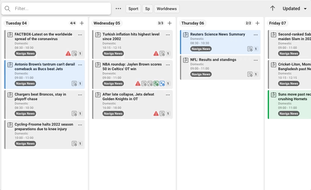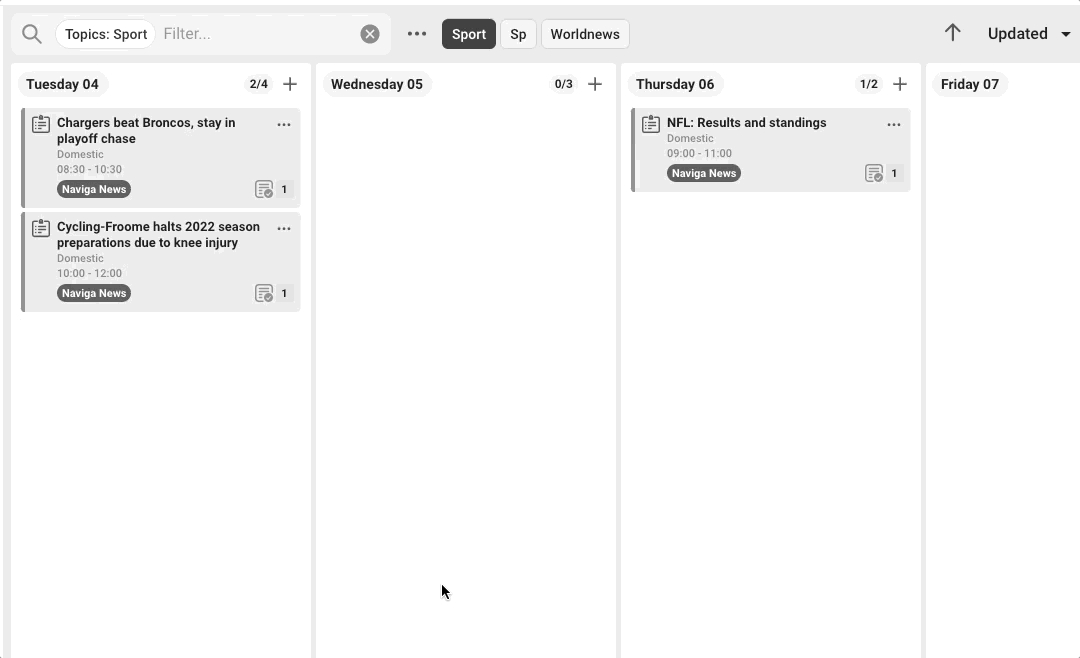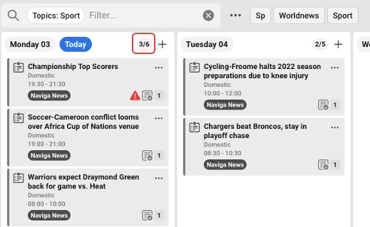 In top of each date you see how many cards there are in total for the date, and how many that is shown according to the filter you have made. In the example below there are 6 cards in the column, but with the filter "sport" you will see 3 of them.