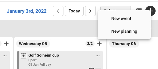 You can create an event via the plus icon in the top bar. This choice is good to choose if it is an event that is in the future, or undated, and you do not want to change the date in your calendar view.