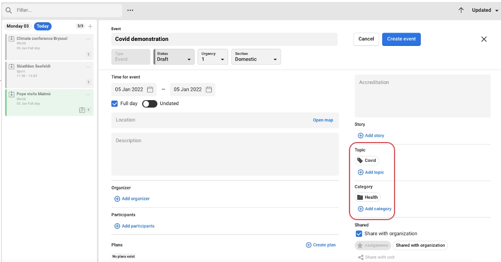 TIP One tip is to add metadata ( as Story, Topic and Category in the screenshot below) already on the event. Doing so this information follows with both the planning, the assignment and the article automatically.