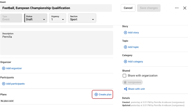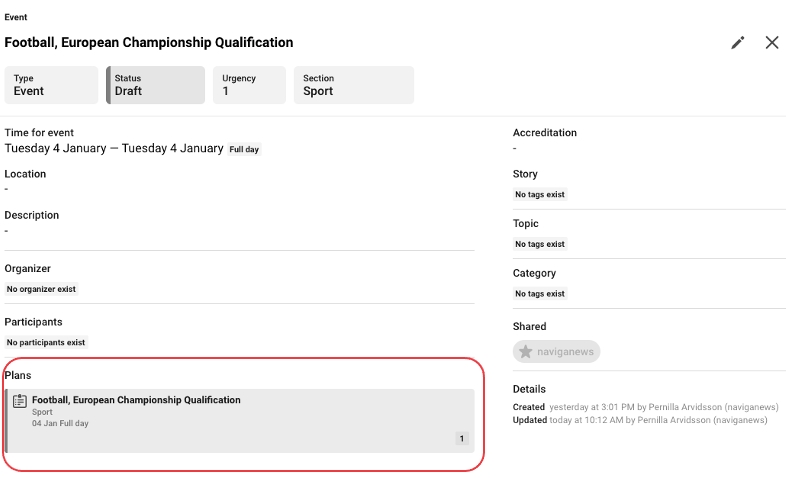 TIP One tip is to add metadata ( as Story, Topic and Category in the screenshot below) already on the plan. Doing so this information follows with both the assignment and the article automatically. If you added it to the event, the metadata from the event automatically follows to the plan so you do not have to do it again.