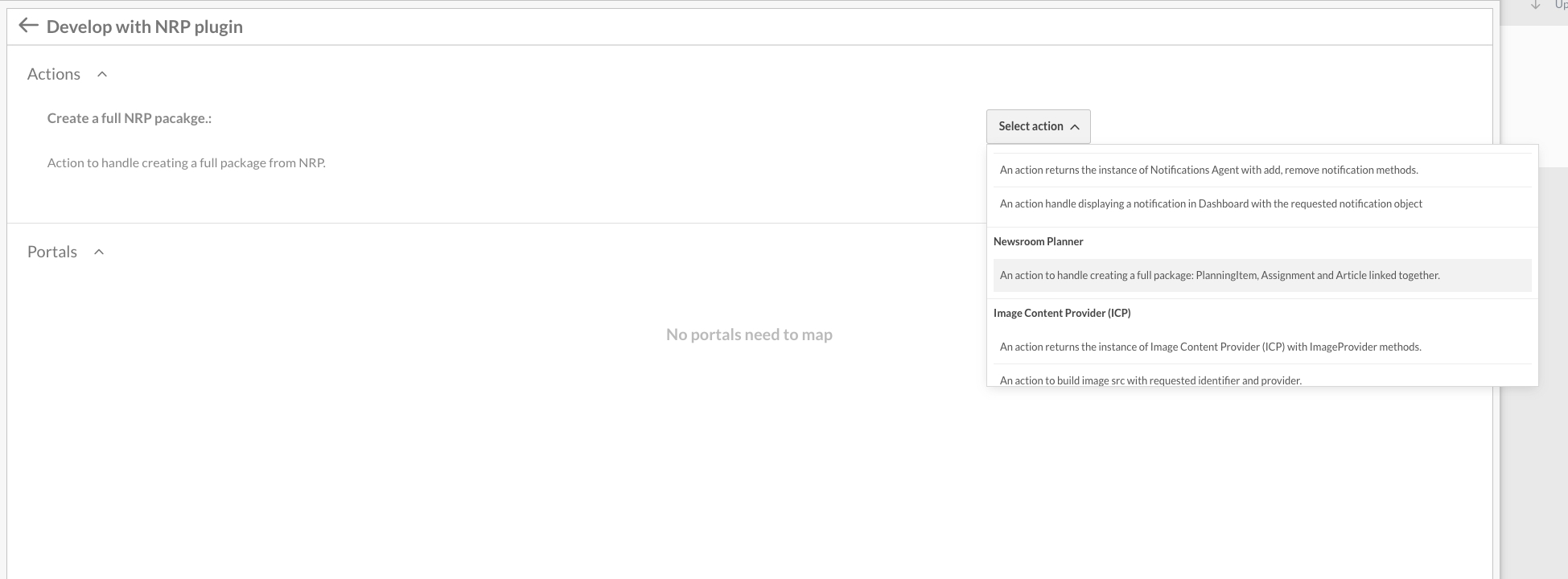 By clicking on Select action, you should see all the available actions from all the installed plugins, including the NRP action.