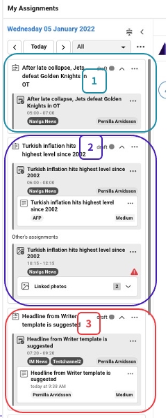 The difference in no 2 compared to no 1 is that there is already an article created on the assignment (1). There is also a photo assignment (2) that belongs to the same plan as your text assignment belongs to. In the case below, the assignee for the photo assignment is not you, but you can use the photos in your article, when the assignee has uploaded them to the assignment.