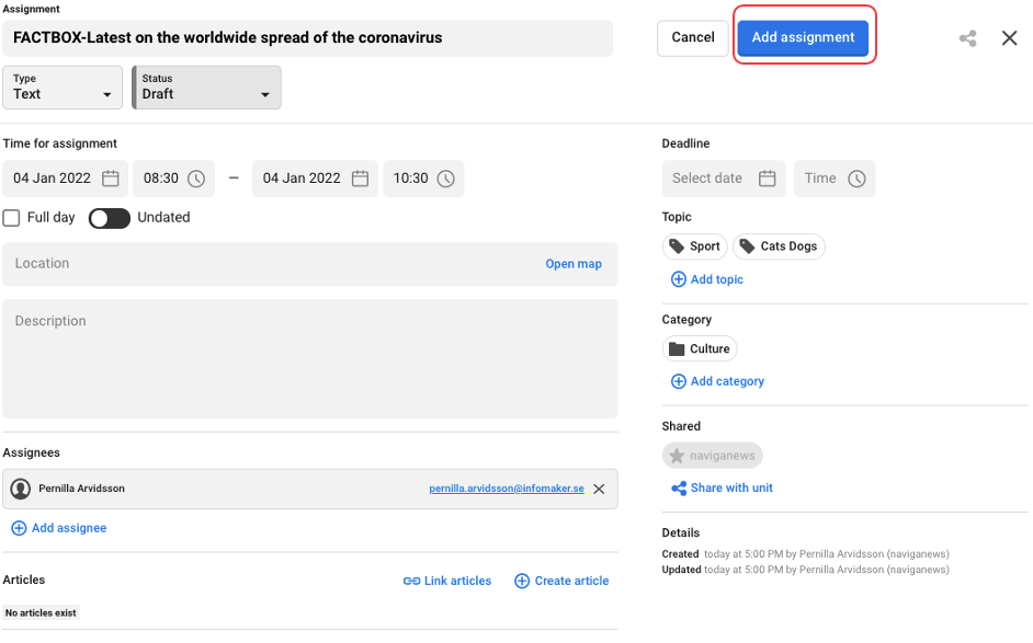 Choose which type you want the assignment to be. If you choose "text", the assignment will be an assignment where you have the possibility to create and manage an article . If you choose "photo" as type, the assignment will have the possibility to link photos from Naviga photos.