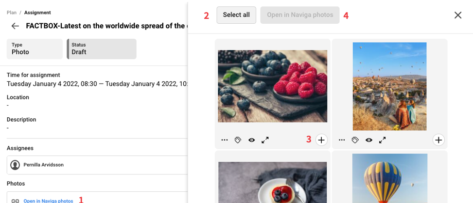 You open the preview by selecting the photos you want to edit. You can select all (2) or just some by marking them selected (3). Then click on the button Open in Naviga Photos (4).