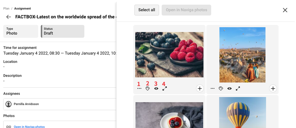 To preview the photos you click on the number of photos. You can do so both in the assignment and on the plan.