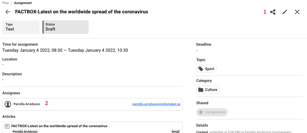You can send the assignees an e-mail notification about the assignment. (To make this function to work, your organization has to make this setting in the configuration.) You see the sharing icon up to the right (1). In this assignment there is one assignees (2).