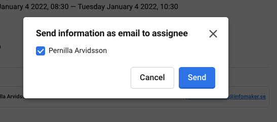 When you have clicked on the sharing icon a dialog will opened up. The assignees in the assignment will be suggested. So of you have several assignees but only want to send the email to one, you deselect the ones that should not get the email. When you click on Send, the assignees will get an email with the information that contains the information in the assignment.