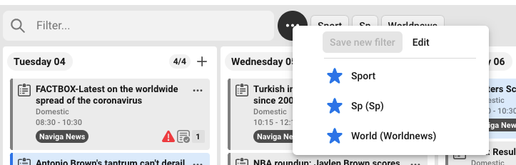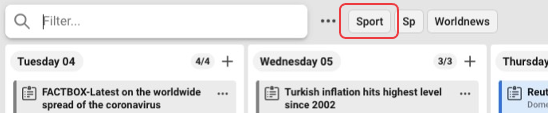 In top of each date you see how many cards there are in total for the date, and how many that is shown according to the filter you have made. In the example below there are 6 cards in the column, but with the filter "sport" you will see 3 of them.
