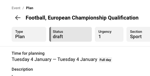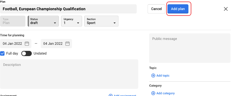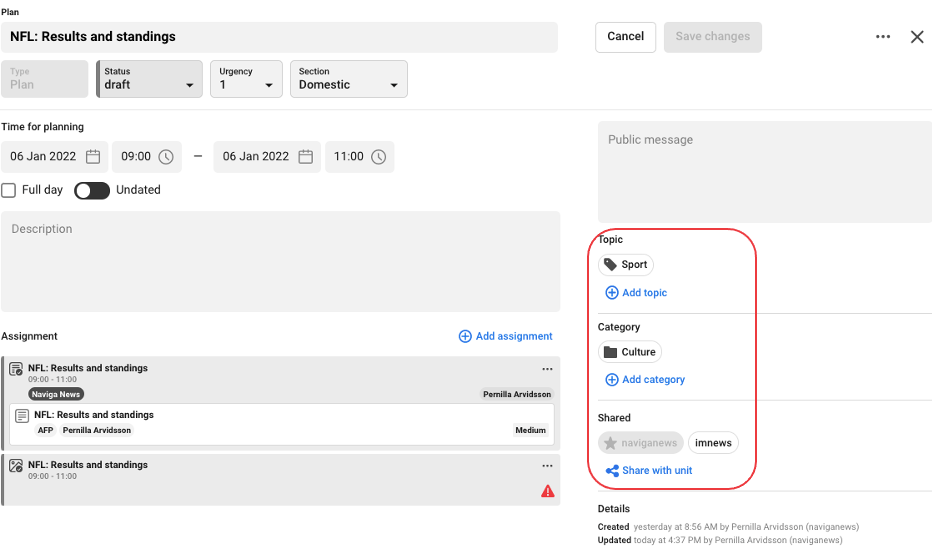 TIP One tip is to add metadata ( as Story, Topic and Category in the screenshot below) already on the plan. Doing so this information follows with both the assignment and the article automatically. If you added it to the event, the metadata from the event automatically follows to the plan so you do not have to do it again.