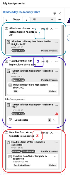 The difference in no 2 compared to no 1 is that there is already an article created on the assignment (1). There is also a photo assignment (2) that belongs to the same plan as your text assignment belongs to. In the case below, the assignee for the photo assignment is not you, but you can use the photos in your article, when the assignee has uploaded them to the assignment.