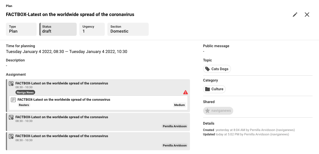 There is only one way to create an assignment in the planning part of Newsroom Planner, unlike events and plans where you can do it in several ways. The reason for that is that an assignment always need a connection to a plan. Therefore it is only possible to create an assignment on the plan.