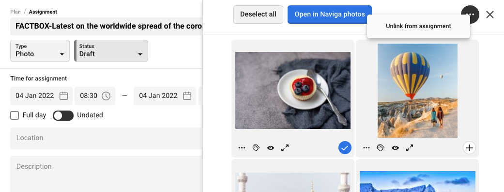 If you want to unlink photos from the assignment you open the assignment for editing. Choose to preview the photos. Mark the ones you want to unlink. Up to the right you have three dots you can click on. Choose to unlink the photos and your selected photos do not have any link to the assignment any more. Do not forget to save the assignment after you have unlinked the photos.