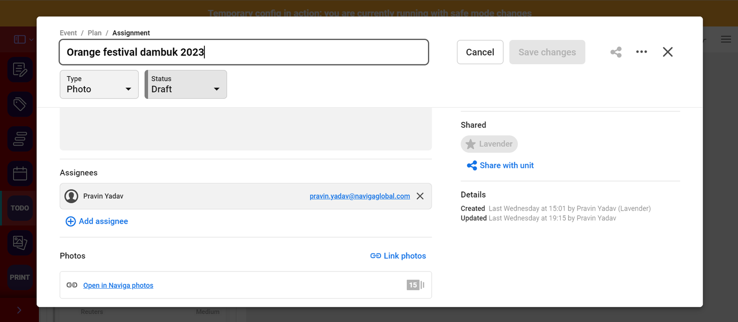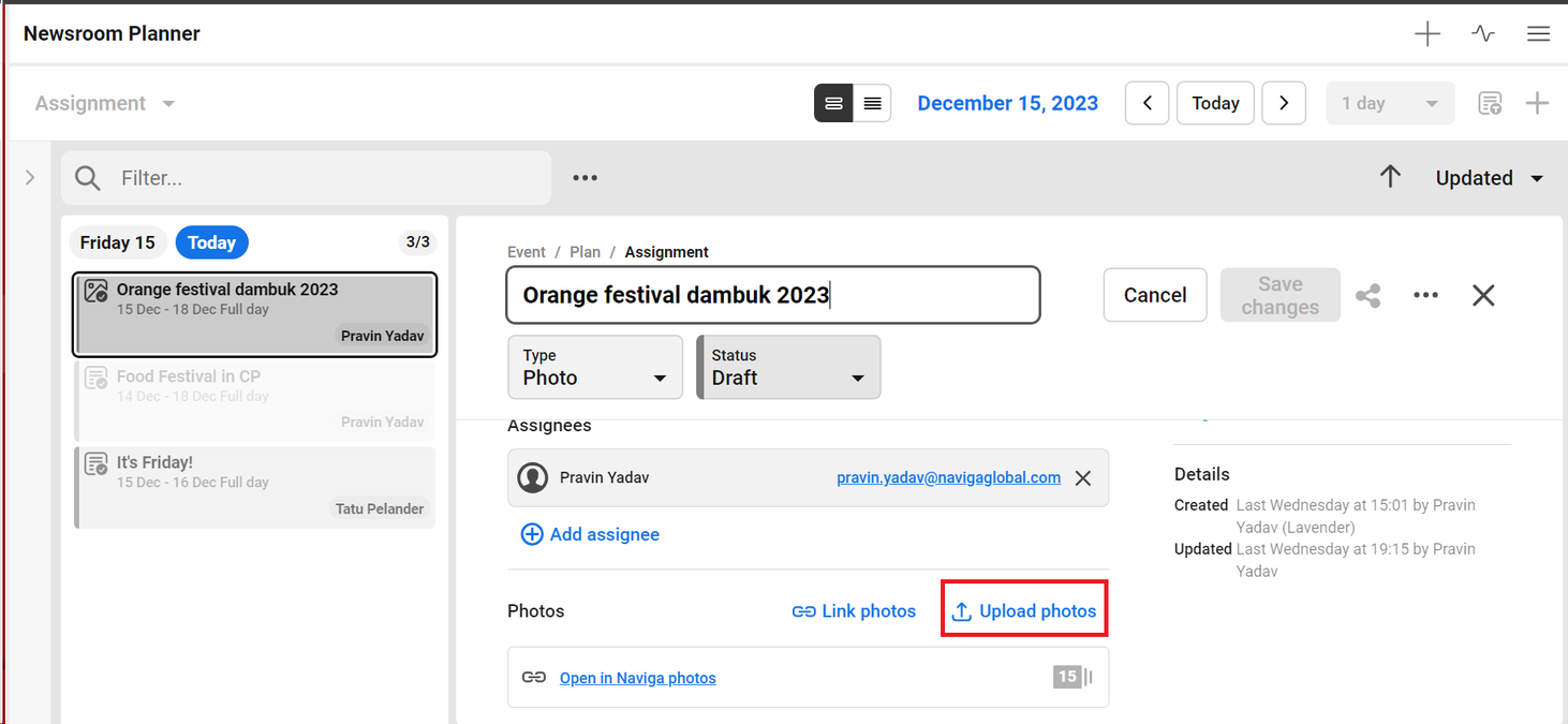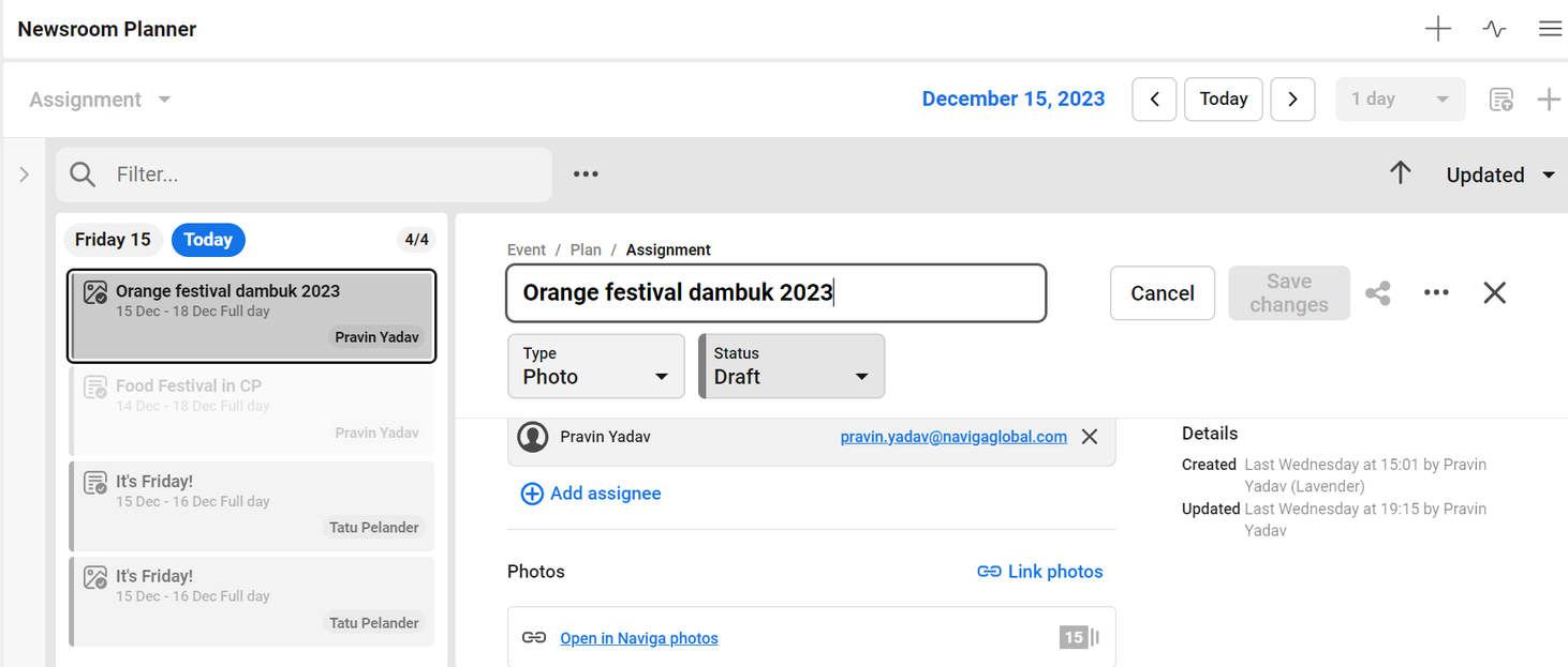 Snippet of Photo assignment of Main Newsroom Planner: