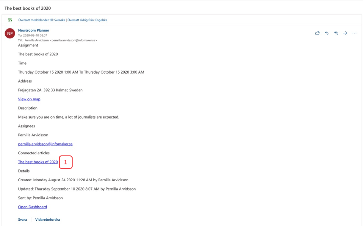 The e-mail the assignee receives, looks like the image below. If you want, you can open the article by clicking on the article link in the e-mail (1).
