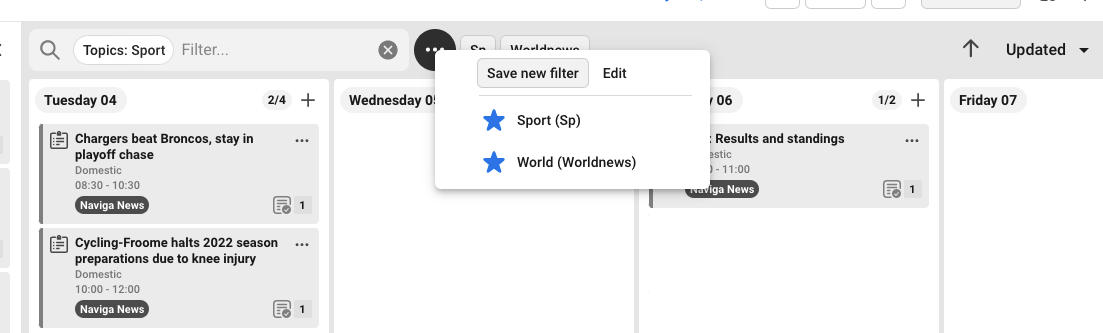 Make the filter you want to save. In the example below: Topic: Sport.
