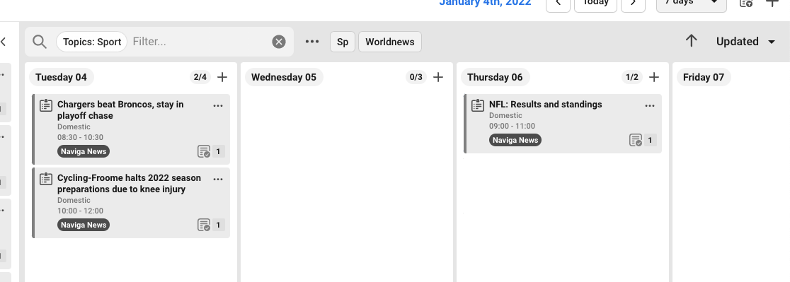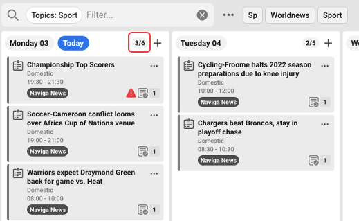 In top of each date you see how many cards there are in total for the date, and how many that is shown according to the filter you have made. In the example below there are 6 cards in the column, but with the filter "sport" you will see 3 of them.