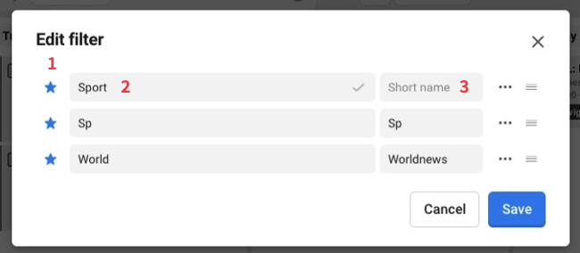 You can favor the filters and you will se them as a button in your view (1), you name the filter (2), if you want a different name on the button you type the name here (3). Click on save.