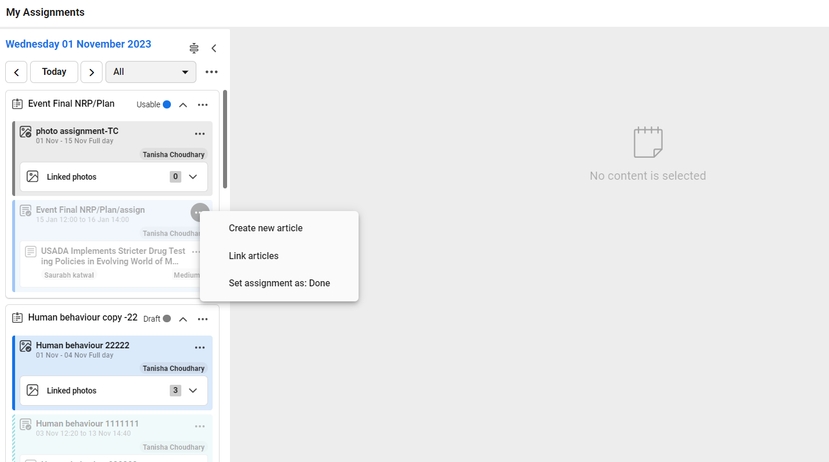 User can view the same multi-day view in My assignment. In this the dimmed card has been enabled for editing and linking the article/photo.