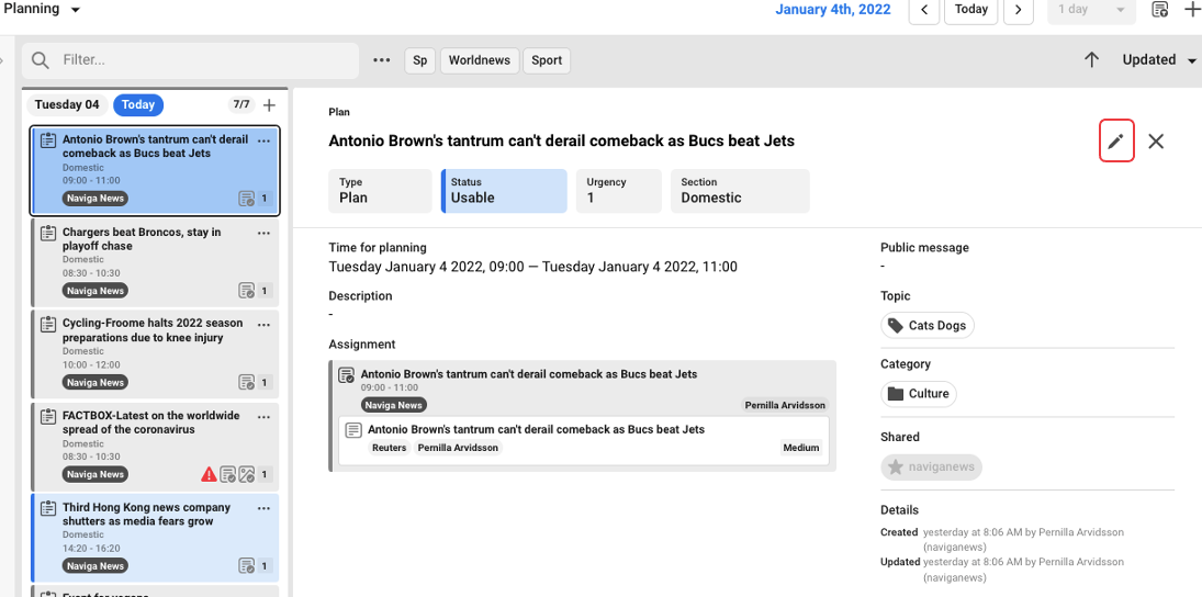When you are done with your editing you click on Save, or Cancel if the editing was not needed. When you are in editing mode, it is not possible to do anything else in Newsroom Planner before you close the editing.