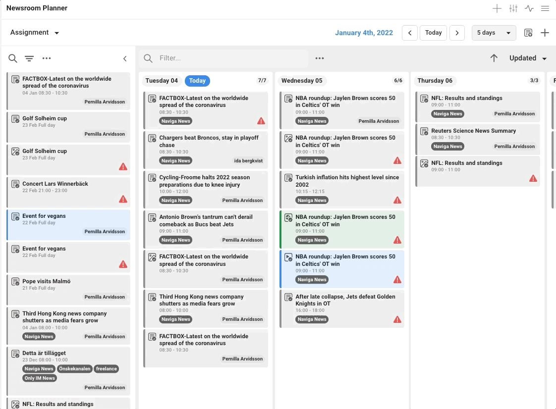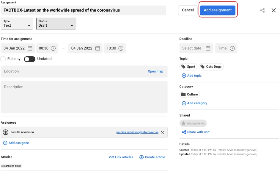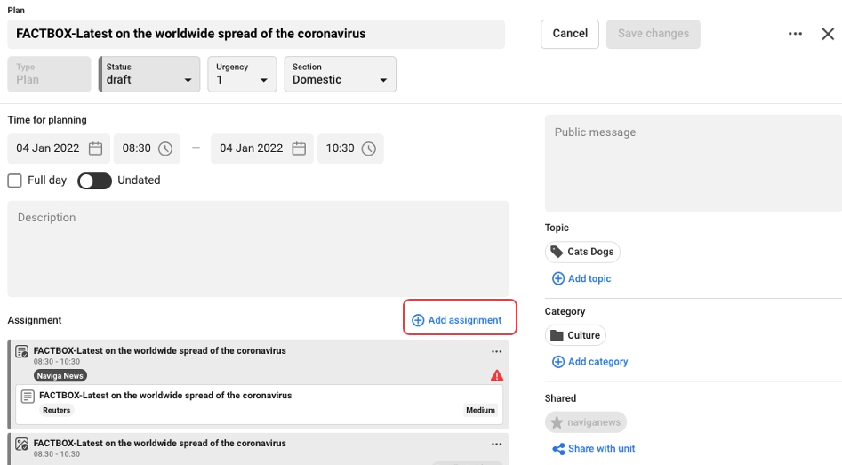 There is only one way to create an assignment in the planning part of Newsroom Planner, unlike events and plans where you can do it in several ways. The reason for that is that an assignment always need a connection to a plan. Therefore it is only possible to create an assignment on the plan.