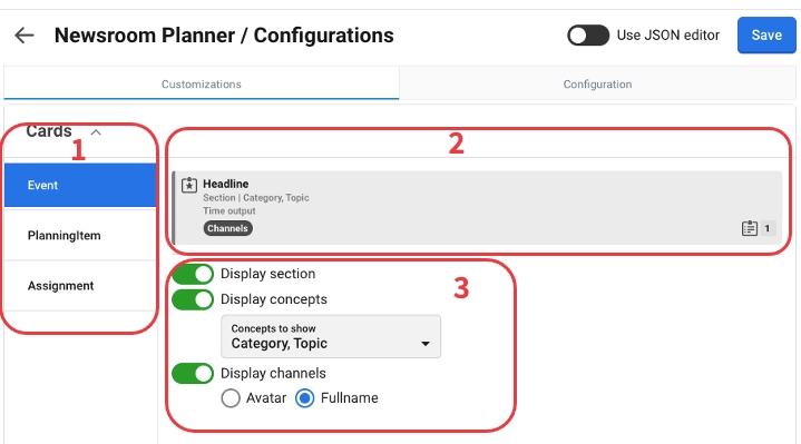 You can customize what information the user of Newsroom Planner sees on each type of cards.
