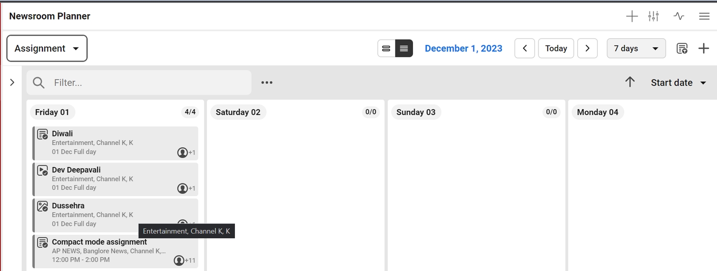 In compact mode user can view more cards in one view. Compact card contains less details as compared to default card with more details available to user on on hover. Toggle button is provided on the left of the date on the top bar and the toggle button is used to switch between default(normal) mode and compact mode.