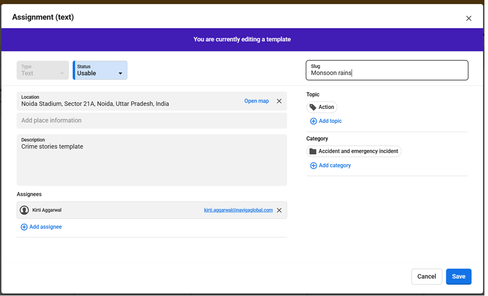 User can add following details in the template and the same content will be pre-populated on adding the new assignment.