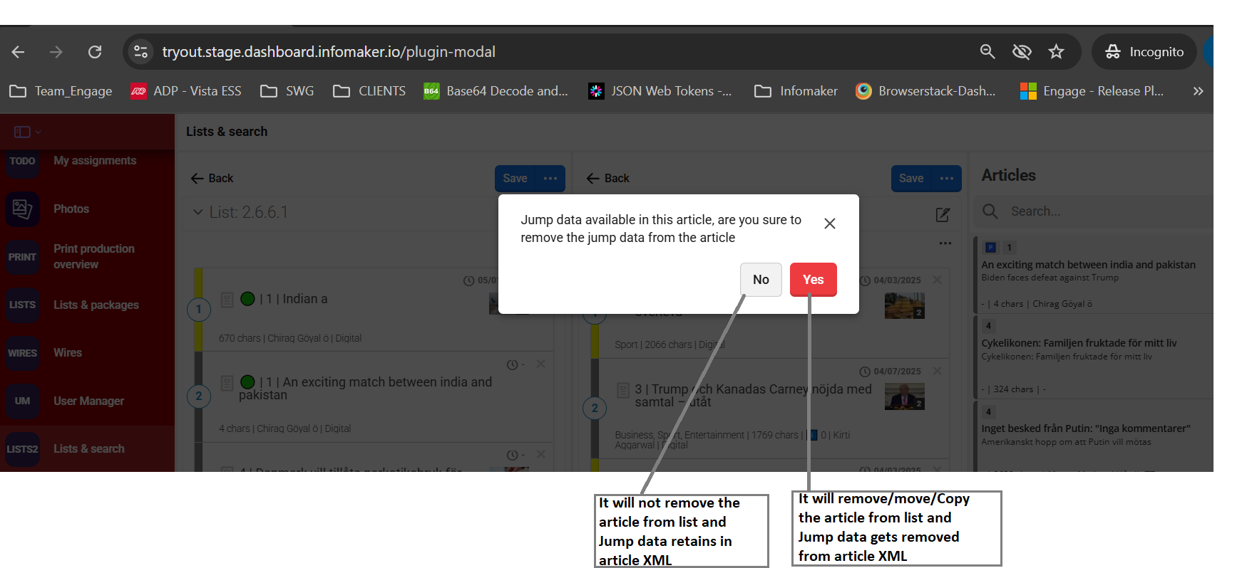 When the user moves the Jump article from one list to another by dragging the article icon and confirms by selecting "Yes" on the prompt, the article is transferred to the new list, and its jump data is removed from the article's XML.