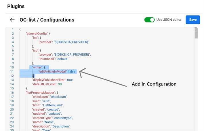 To configure opening from a list in Modal view, the configuration of the OC-List plugin must be modified as follows (access to configuration requires administrative privileges):