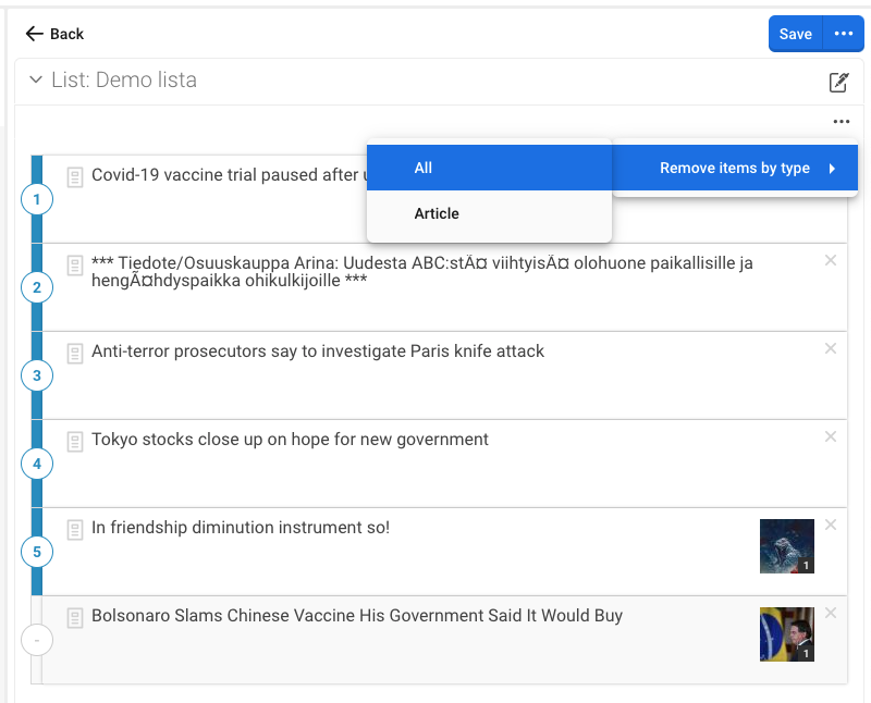 By clicking the list menu you will be presented with a subset of choices to alter the list. In the example you will see "Remove items by type". This will lead to a submenu presenting all types in the list. Either you can remove all elements or just all of a certain type.