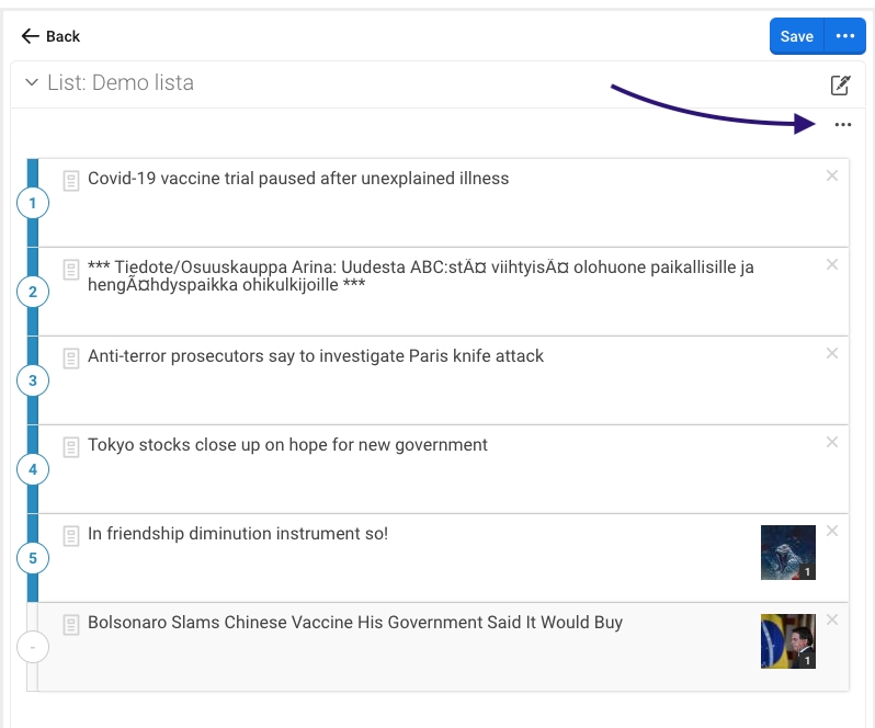 To remove an article from the list, click the "X" in the upper right-hand corner of the article's card on the list. Be sure to save the list after you have removed your article(s).