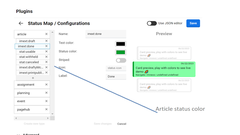 Different type of article’s status such as Draft, Usable, Done, Withheld, withheld, cancelled, DraftyMcDraftFace, PrintPublisher have a separate color code. These colors can be assigned manually in Status Map Plugin.