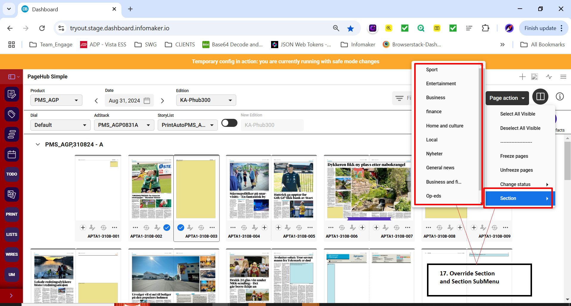 4. Override Section: "Section" and its Submenu appears in Page action options when Configuration settings are added for Override Section on Page hub. It allows user to select a section from the list to override the existing section on the pages, Once the new section is selected then section would be changed on the selected Pages.